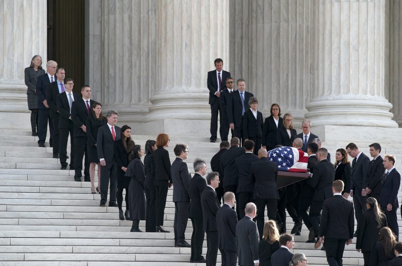 Pallbearers rested O’Connor’s casket on the Lincoln Catafalque, the simple pine-board bier constructed to support the casket of Abraham Lincoln in 1865. Since 1873, it has been used for Supreme Court justices, former presidents and others, including Thurgood Marshall in 1993, John McCain in 2018 and Ruth Bader Ginsburg in 2020.
